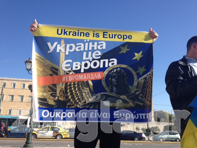 Oι διαδηλωτές ζητούσαν τη στήριξη των Ελλήνων όσον αφορά το ευρωπαϊκό μέλλον της Ουκρανίας.