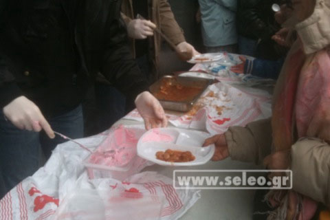 Δεκάδες κάτοικοι της Θεσσαλονίκης, παρά τη βροχή, συγκεντρώθηκαν κοντά στο κολυμβητήριο όπου διανεμόταν δωρεάν φασολάδα και έκαναν ουρές για να εξασφαλίσουν ένα πιάτο.