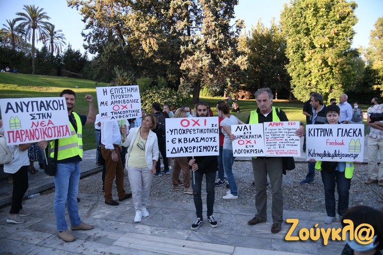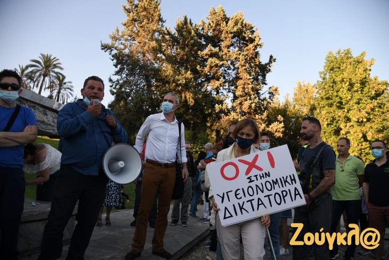 Κρατώντας πλακάτ που έγραφαν «Όχι σε υποχρεωτικότητες, εκβιασμούς, διαχωρισμούς» και «Ναι στη δημοκρατία, όχι στη λογοκρισία» οι συγκεντρωμένοι υγειονομικοί διατράνωσαν την αντίθεση τους στην απόφαση της κυβέρνησης για τον υποχρεωτικό εμβολιασμό τους.