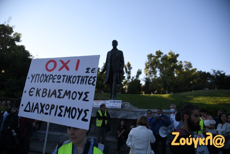 Εκατοντάδες υγειονομικοί που είναι σε αναστολή επειδή δεν έχουν κάνει το εμβόλιο κατά του κορωνοϊού συγκεντρώθηκαν το απόγευμα του Σαββάτου στο πάρκο Ελευθερίας, στην Αθήνα, για να εκφράσουν τις δικαιολογημένες διαμαρτυρίες τους και να ζητήσουν από την κυβέρνηση να τους επαναφέρει στην εργασία τους.