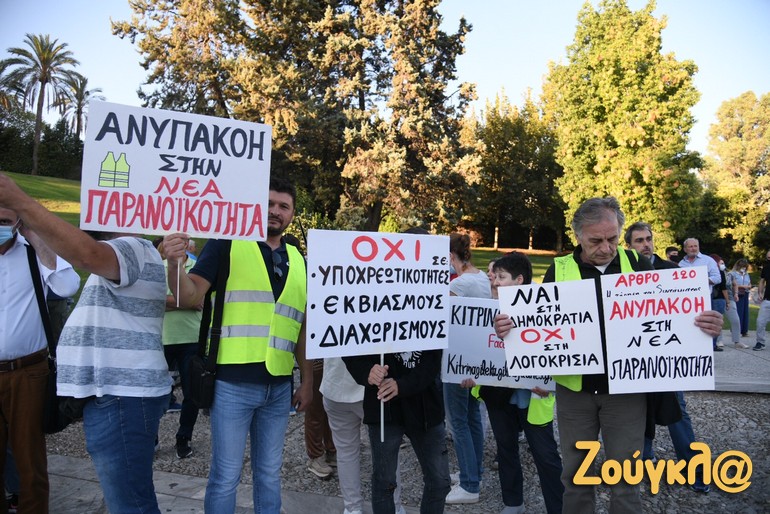 Κρατώντας πλακάτ που έγραφαν «Όχι σε υποχρεωτικότητες, εκβιασμούς, διαχωρισμούς» και «Ναι στη δημοκρατία, όχι στη λογοκρισία» οι συγκεντρωμένοι υγειονομικοί διατράνωσαν την αντίθεση τους στην απόφαση της κυβέρνησης για τον υποχρεωτικό εμβολιασμό τους.