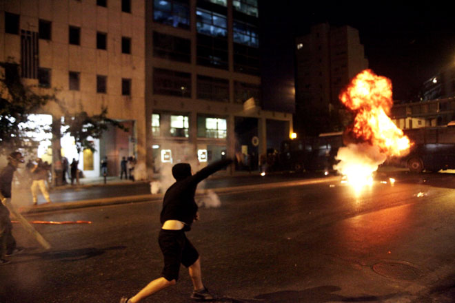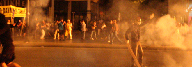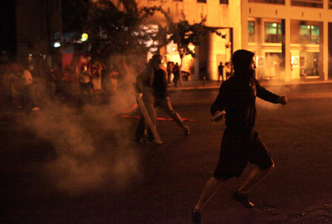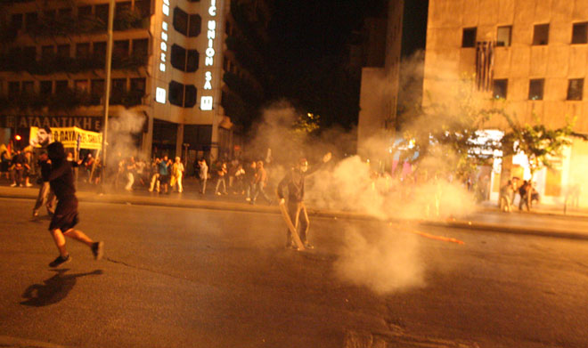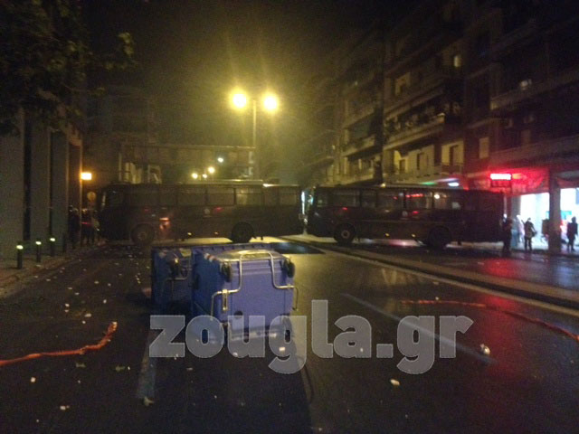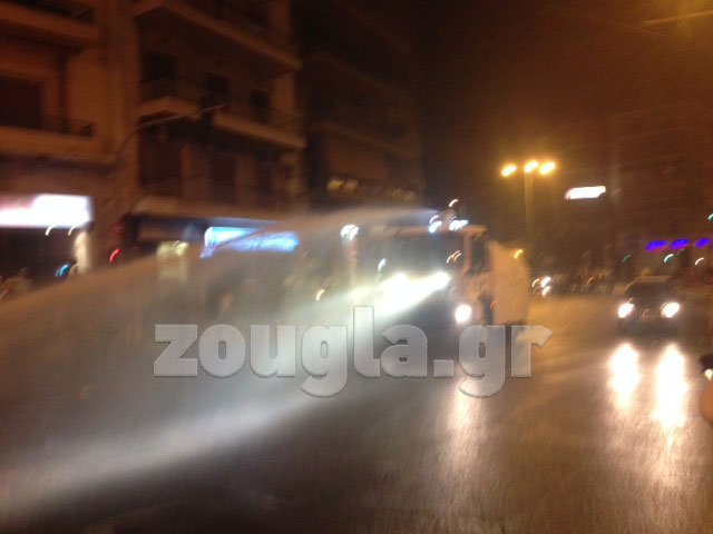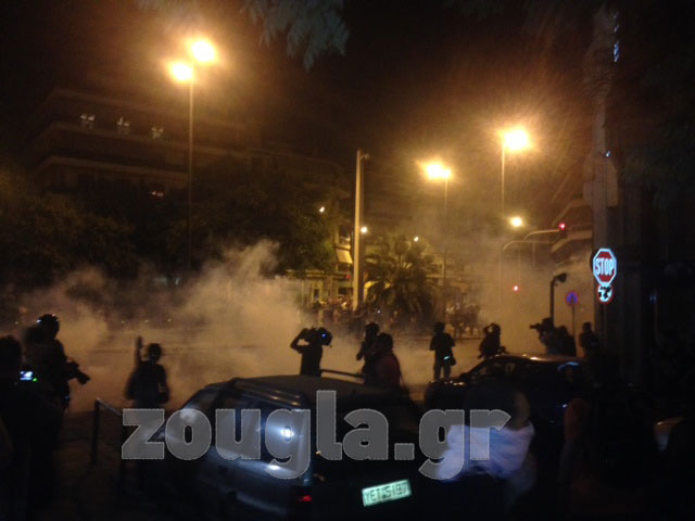 Ωστόσο, στις 20.10, μερίδα διαδηλωτών πέταξε προς τους αστυνομικούς πέτρες, αλλά και βόμβες μολότοφ και οι αστυνομικοί των ΜΑΤ απάντησαν με κρότου λάμψης και χημικά. Ο κύριος όγκος των διαδηλωτών αποχώρησε μετά τη ρίψη χημικών, ενώ στο σημείο παρέμειναν για μία περίπου μία ώρα κάποιοι νεαροί που έβαλαν φωτιά σε τουλάχιστον 10 κάδους.