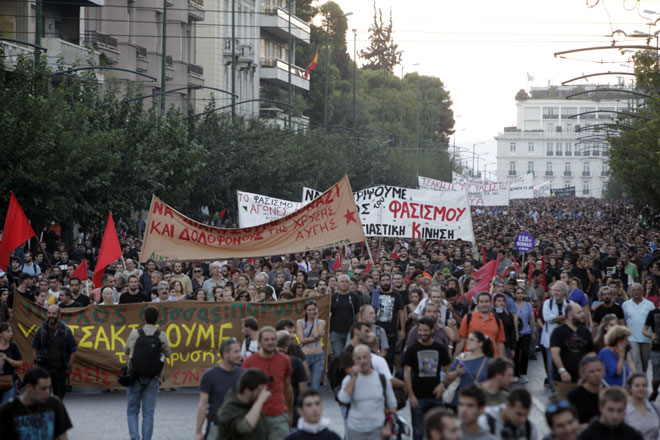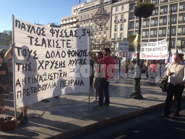 «Ο Παύλος ζει, τσακίζει τους ναζί» ήταν το κεντρικό σύνθημα των περίπου 5.000 διαδηλωτών που συγκεντρώθηκαν στην πλατεία Συντάγματος, ανταποκρινόμενοι στο κάλεσμα για μαζική συμμετοχή στο αντιφασιστικό συλλαλητήριο της ΓΣΕΕ και της ΑΔΕΔΥ την Τετάρτη, αλλά και των κομμάτων. Το συλλαλητήριο πραγματοποιήθηκε από τις 18.00 το απόγευμα στο Σύνταγμα όπου και ακολούθησε συναυλία. Σημειώνεται ότι την ίδια ώρα πραγματοποιήθηκαν αντιφασιστικές συγκεντρώσεις σε Θεσσαλονίκη, Σέρρες, Ιωάννινα, Βόλο, Ηράκλειο, Κατερίνη και Χανιά.