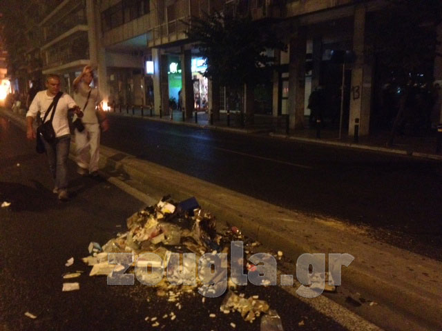 (Καθώς αποχωρούσαν ορισμένοι διαδηλωτές έκαψαν κάδους στα Εξάρχεια. Φωτογραφία από τη συμβολή των οδών Ιπποκράτους και Αλεξάνδρας)