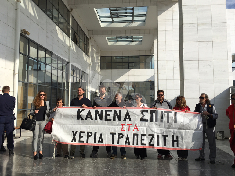 «Κανένα σπίτι στα χέρια τραπεζίτη» και «ΟΧΙ στην αρπαγή της Λαϊκής Περιουσίας» ήταν ορισμένα από τα συνθήματα που ήταν γραμμένα πάνω στα πανόΌπως και στη Θεσσαλονίκη, έτσι και σε αρκετές γειτονιές της Αθήνας, συλλογικότητες καλούν τους πολίτες σε «επαγρύπνηση» προκειμένου να αποτραπούν κατασχέσεις και πλειστηριασμοί κατοικιών που ανήκουν σε φτωχά λαϊκά στρώματα.