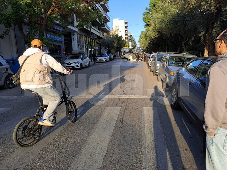 Το αυτοκίνητο που έχει ανατραπεί στη μέση της οδού Υμηττού στο Παγκράτι