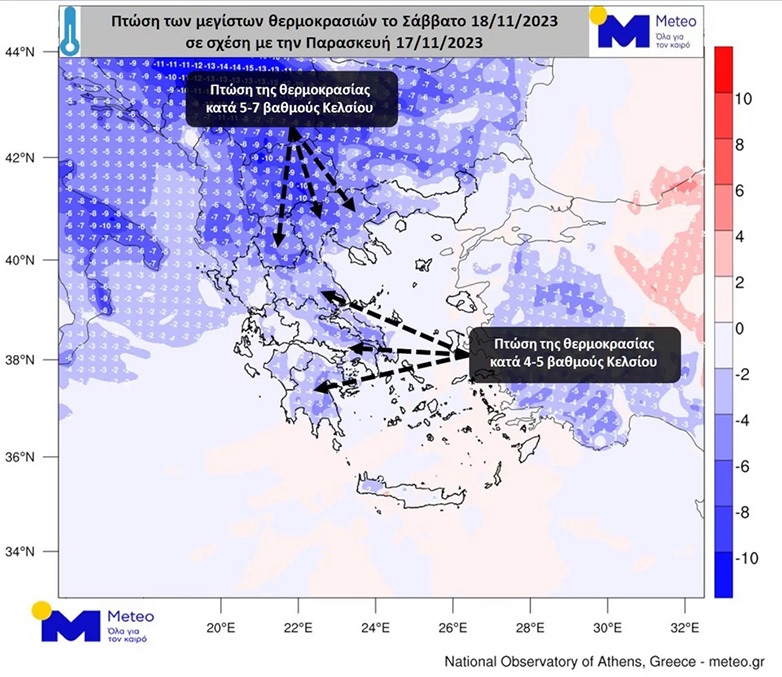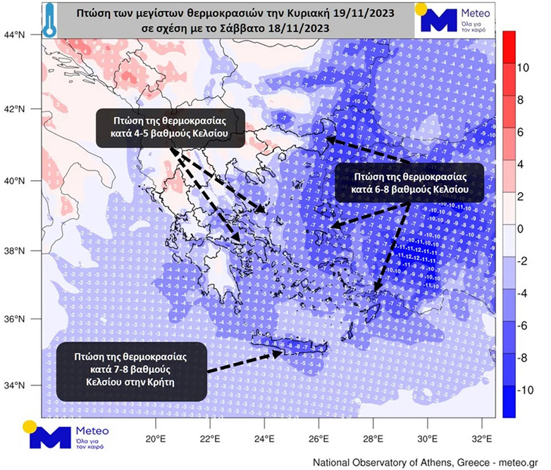 Σημειώνεται ότι η αναφορά γίνεται στις μέσες εντάσεις ανέμου και ότι κατά τόπους αναμένονται ριπές άνω των 80κm/h. Αισθητή θα είναι η πτώση των μεγίστων θερμοκρασιών σε σχέση με την Παρασκευή (17/11).