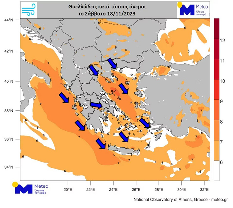 Πρόγνωση μέγιστης μέσης έντασης ανέμων σε μποφόρ το Σάββατο 18 Νοεμβρίου 2023. Εμφανίζονται μόνο οι τιμές άνω των 6 μποφόρ.