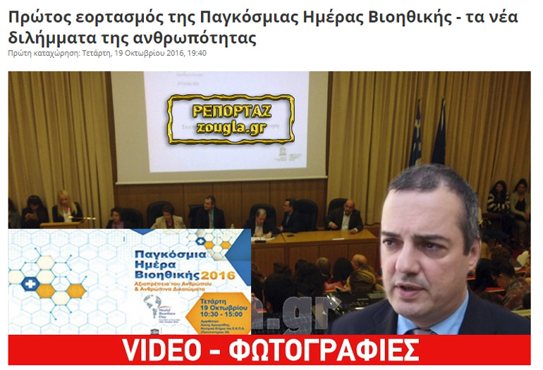 Σήμερα εορτάστηκε -για δεύτερη φορά- σε όλο τον κόσμο, η Παγκόσμια Ημέρα Βιοηθικής και στην Αθήνα διοργανώθηκε συνέδριο στα γραφεία του Δικηγορικού Συλλόγου Αθηνών από το Ελληνικό Κλιμάκιο της Έδρας Βιοηθικής της UNESCO και το Εργαστήριο Εφαρμοσμένης Φιλοσοφίας του Τμήματος Φ.Π.Ψ. του Ε.Κ.Π.Α., σε συνεργασία με την Ένωση Ελλήνων Νομικών e-Θέμις, το Ερευνητικό Κέντρο Βιοπολιτικής του Παντείου Πανεπιστημίου και την Ελληνική Ένωση Προστασίας Προσωπικών Δεδομένων και Ιδιωτικότητας.