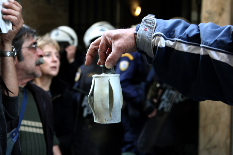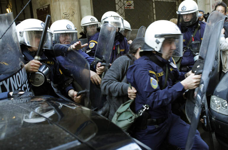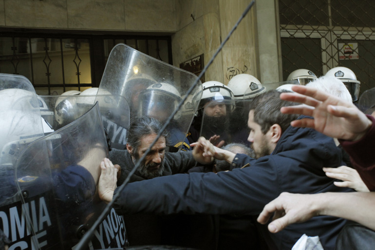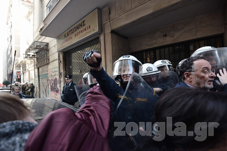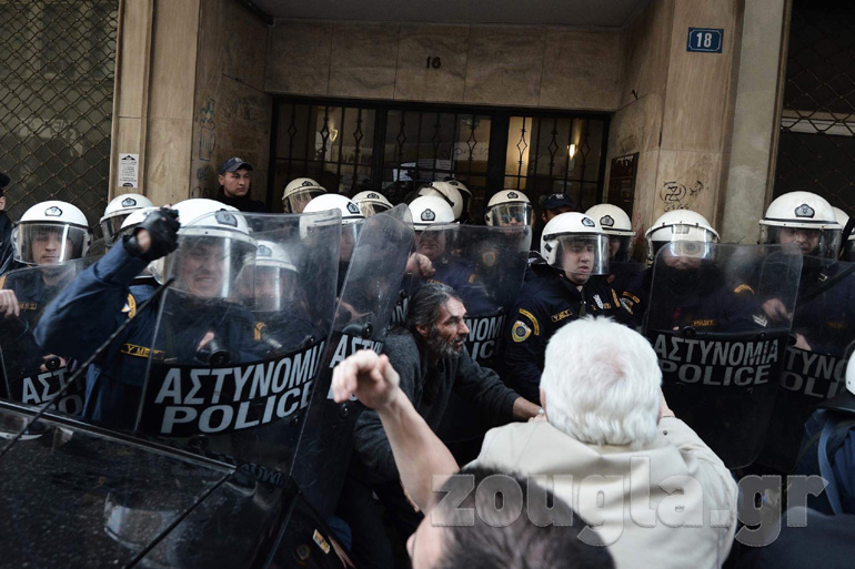 Η ένταση πυροδοτήθηκε όταν η αστυνομία είπε στους συγκεντρωμένους ότι στο συμβολαιογραφείο θα έπρεπε να ανέβουν μόνο ο Παναγιώτης Λαφαζάνης και ο Δημήτρης Στρατούλης. Ωστόσο, εκείνοι αρνήθηκαν και κινήθηκαν προς τους αστυνομικούς, με αποτέλεσμα να σημειωθούν επεισόδια. Στη συνέχεια οι διαδηλωτές απωθήθηκαν από τους άνδρες της Αστυνομίας που χτύπησαν τους διαμαρτυρόμενους με γκλομπς και έκαναν χρήση χημικών.