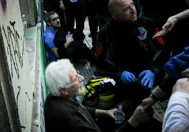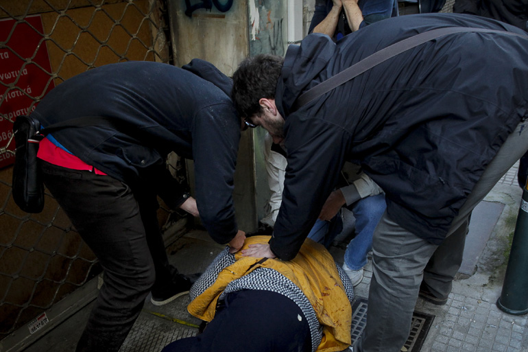 Εδώ είχαμε τα ΜΑΤ να μας πετάνε αθρόα χημικά, να μας χτυπάνε με γκλομπ, ακόμη να πετάνε και μπουκάλια, με αποτέλεσμα να έχουμε πολλούς με αναπνευστικά προβλήματα και λιποθυμίες, ενώ τρεις αγωνιστές, εκ των οποίων δύο στελέχη της ΛΑ.Ε, τραυματίστηκαν και μεταφέρθηκαν με το ασθενοφόρο του ΕΚΑΒ στο «Σωτηρία» και το «Λαϊκό».