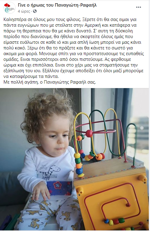 Χρησιμοποιώντας τη «φωνή» του Παναγιώτη-Ραφαήλ, οι διαχειριστές της σελίδας μεταδίδουν το μήνυμά του, με το οποίο υπενθυμίζει τους ευάλωτους, που η έκθεση σε έναν ιό μπορεί να τους κάνει κακό.