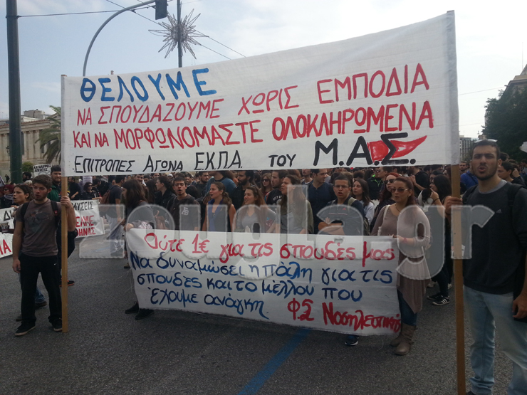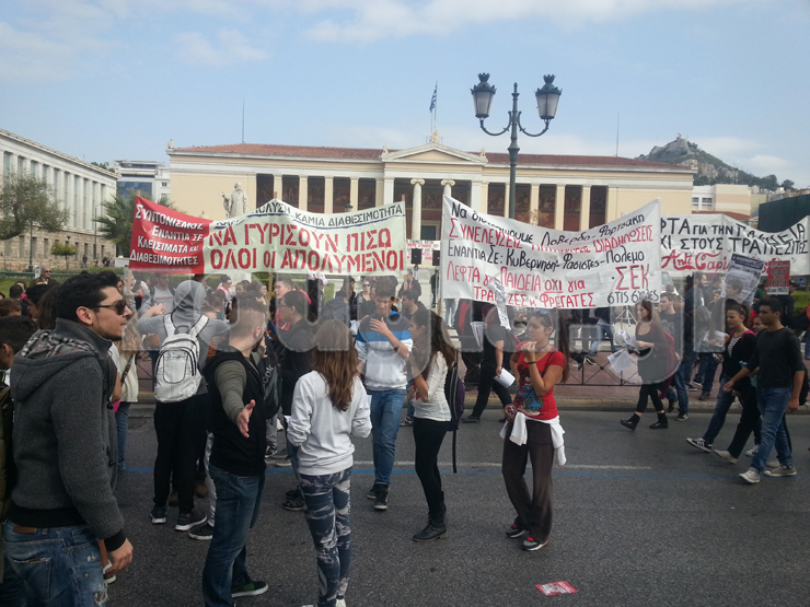 Πλήθος κόσμου συγκεντρώθηκε στις 12.00 το μεσημέρι μπροστά από τα Προπύλαια, κρατώντας πανό με συνθήματα κατά του Υπουργείου Παιδείας. Μετά τις 14.00, πραγματοποιήθηκε πορεία προς το Κοινοβούλιο. Μαθητές και εκπαιδευτικοί διαμαρτύρονται για τις προωθούμενες αλλαγές στην Παιδεία και συγκεκριμένα για το «Νέο Σχολείο», την τράπεζα θεμάτων, τις συγχωνεύσεις τμημάτων και την υποχρηματοδότηση των σχολείων.