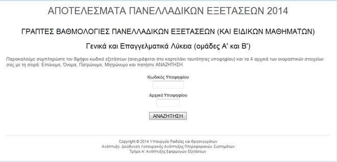 Οι υποψήφιοι θα μπορούν να πληροφορούνται τα αποτελέσματα μέσω της ιστοσελίδας του υπουργείου http://results.it.minedu.gov.gr πληκτρολογώντας: