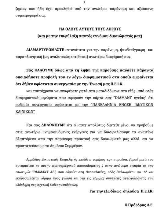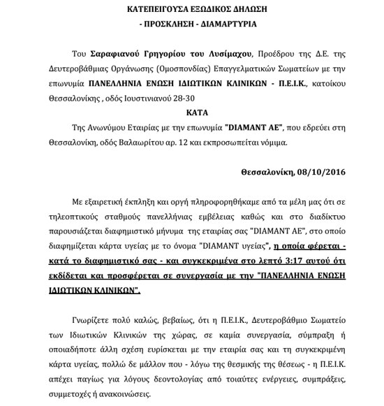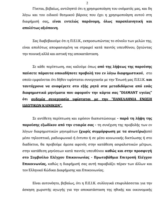 Με την εξώδικο αυτή διαμαρτύρεται εντονότατα για την παράνομη ψευδεπίγραφη και παραπλανητική διαφήμισή της, την καλεί όπως από τη λήψη της εξωδίκου παύσει πάραυτα οποιαδήποτε προβολή του εν λόγω διαφημιστικού, στο οποίο εμφαίνεται ότι δήθεν υφίσταται συνεργασία με την Πανελλήνια Ένωση Ιδιωτικών Κλινικών και ταυτόχρονα την καλεί να αναφέρει ρητά στα μεταδιδόμενα από αυτήν διαφημιστικά μηνύματα που αφορούν την εν λόγω κάρτα υγείας ότι ουδεμία συνεργασία υφίσταται με την «ΠΑΝΕΛΛΗΝΙΑ ΕΝΩΣΗ ΙΔΙΩΤΙΚΩΝ ΚΛΙΝΙΚΩΝ».