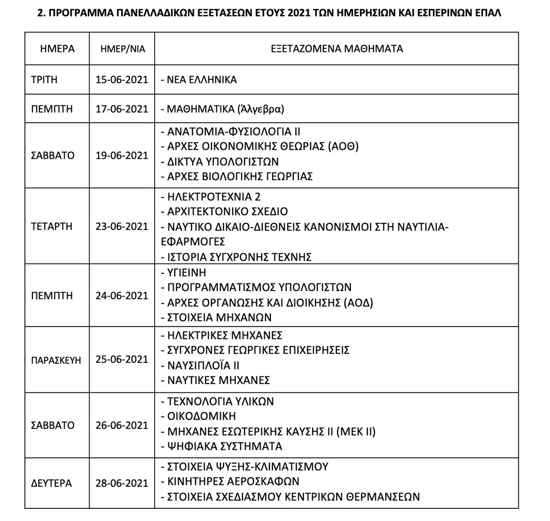 Το Υπουργείο Παιδείας και Θρησκευμάτων ανακοίνωσε το απόγευμα της Τετάρτης, 12.05.2021, το πρόγραμμα για τις Πανελλήνιες εξετάσεις των Γενικών Λυκείων και των Επαγγελματικών Λυκείων για τη φετινή χρονιά εν μέσω Covid-19.