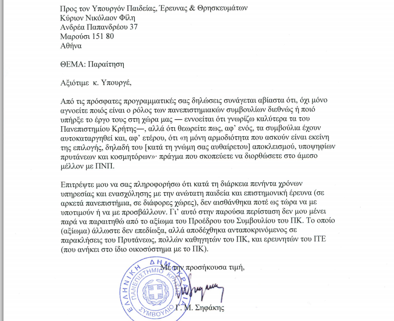 Ωστόσο, η συγκεκριμένη αποστροφή του προκάλεσε την άμεση αντίδραση του προέδρου του Συμβουλίου του Πανεπιστημίου Κρήτης, καθηγητή της κλασσικής φιλολογίας κ. Γρηγόρη Σηφάκη, ο οποίος με μία αιχμηρή επιστολή υπέβαλε την παραίτησή του.