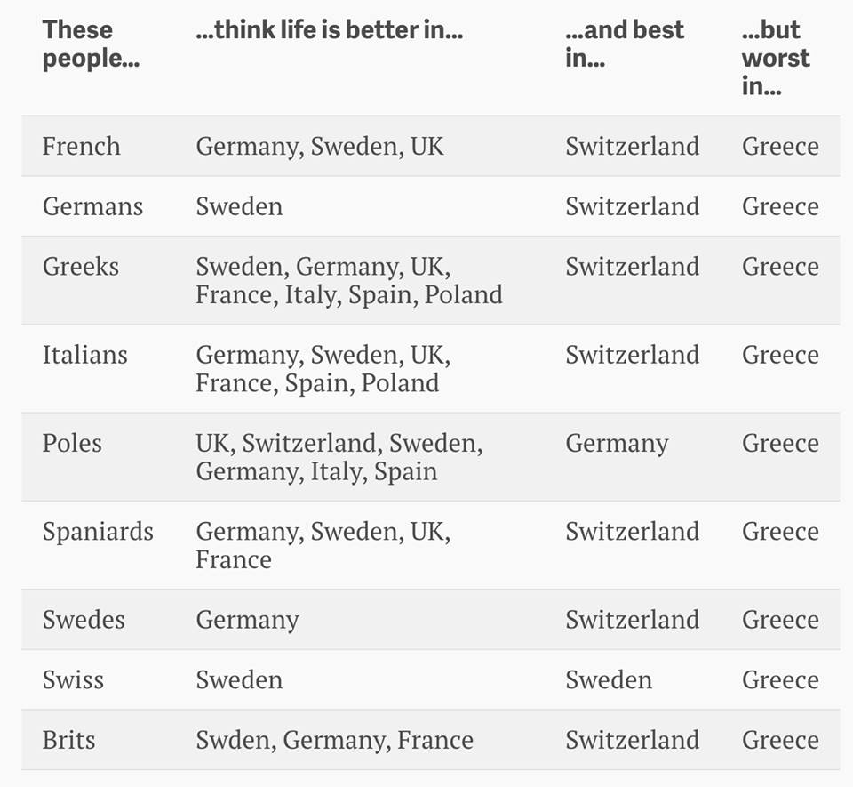 Σε έρευνα επιστημόνων από το Πανεπιστήμιο της Γενεύης, καταγράφονται οι αντιλήψεις των πολιτών εννέα ευρωπαϊκών χωρών για τη ζωή σε άλλες χώρες της Ευρώπης. Οι πολίτες 7 εκ των 9 χωρών συμφωνούν ότι η ζωή είναι καλύτερη σε μία συγκεκριμένη χώρα -την Ελβετία.