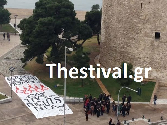 Μέλη της Good As You(th) – Κοινότητας lgbtiq νέων Θεσσαλονίκης ανήρτησαν πανό δίπλα στον Λευκό Πύργο, διαμαρτυρόμενοι για τον anti gay νόμο της Ρωσίας, με αφορμή την έναρξη των Χειμερινών Ολυμπιακών Αγώνων στο Sochi. Μάλιστα, το απόγευμα, στις 18.00, θα πραγματοποιήσουν συγκέντρωση διαμαρτυρίας στην Καμάρα.