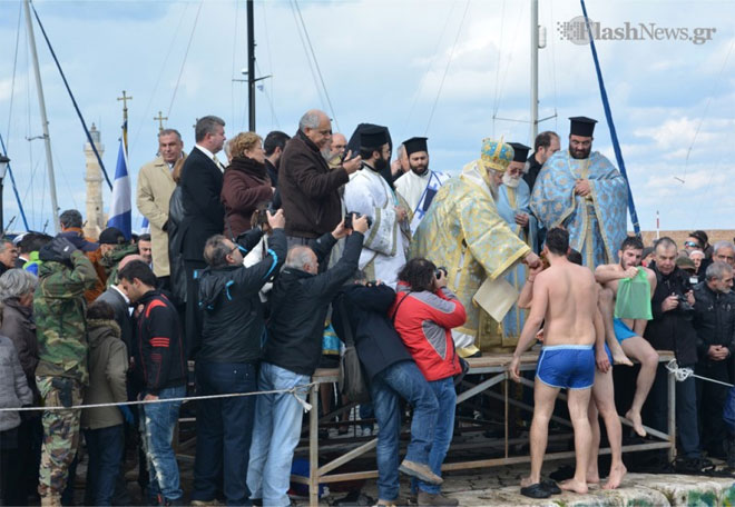 Τον Σταυρό στη θάλασσα έριξε ο Μητροπολίτης Κυδωνίας – Αποκορώνου Δαμασκηνός, ενώ δεν ήταν λίγοι αυτοί που βούτηξαν στα παγωμένα νερά για να τον πιάσουν. Νωρίτερα τελέστηκε θεία λειτουργία και Μέγας Αγιασμός στον Μητροπολιτικό Ναό των Χανίων.