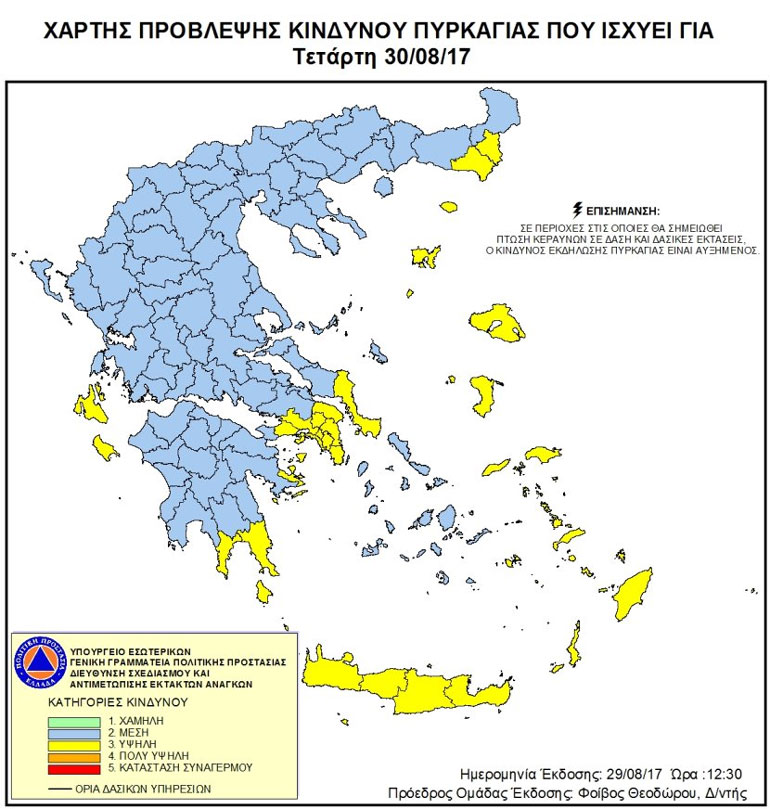 Εξακολουθεί να είναι υψηλός ο κίνδυνος πυρκαγιάς σε διάφορες περιοχές της Ελλάδας. Ειδικότερα, σύμφωνα με τον χάρτη πρόβλεψης, προβλέπεται σήμερα υψηλός κίνδυνος (δείκτης 3) για τους Νομούς Αττικής, Εύβοιας, Έβρου, Αργολίδας, Λακωνίας, Δωδεκανήσου και για τα νησιά Κρήτη, Σάμο, Ικαρία, Χίο, Λέσβο, Λήμνο, Κύθηρα, Κεφαλονιά και Ζάκυνθο.