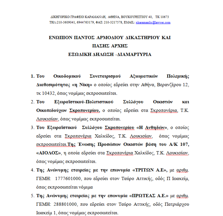Εκτός της επιστολή των κατοίκων προς τον Πρωθυπουργό, σύλλογοι οικιστών αλλά και εταιρίες έχουν αποστείλει εξώδικο προς την Αποκεντρωμένη Διοίκηση Θεσσαλίας Στερεάς Ελλάδος, ζητώντας να σταματήσουν οι δραστηριότητες της εταιρίας.