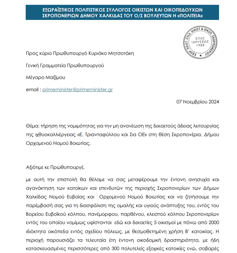«Αξιότιμε κε Πρωθυπουργέ, με αυτή την επιστολή θα θέλαμε να σας μεταφέρουμε την έντονη ανησυχία και αγανάκτηση των κατοίκων και επενδυτών της περιοχής Σκροπονερίων των Δήμων Χaλκίδας Νομού Ευβοίας και Ορχομενού Νομού Βοιωτίας και να ζητήσουμε την παρέμβασή σας για τη διασφάλιση της ομαλής και υγιούς ανάπτυξης του, εντός του Βορείου Ευβοϊκού κόλπου, πανέμορφου, παρθένου, κλειστού κόλπου Σκροπονερίων εντός του οποίου νομίμως υφίστανται εδώ και δεκαετίες 5 οικισμοί με πάνω από 2000 ιδιόκτητα οικόπεδα εντός σχεδίου πόλεως, με θεσμοθετημένη χρήση Β’ κατοικίας. Η περιοχή παρουσιάζει τα τελευταία έτη έντονη οικοδομική δραστηριότητα, με ήδη κατασκευασμένες περισσότερες από 300 πολυτελείς εξοχικές κατοικίες ενώ, σοβαρές αναπτυξιακές εταιρείες ενδιαφέρονται για τουριστικές επενδύσεις, της τάξεως του 1.000.000.000€. Εντός του κλειστού κόλπου, στον Δήμο Ορχομενού νομού Βοιωτίας, δραστηριοποιείται εδώ και 37 χρόνια μία μικρή επιχείρηση ιχθυοκαλλιέργειας με τον όνομα «Ε. Τριανταφύλλου & Σία ΟΕ». Η εν λόγω επιχείρηση ασκεί κατ’ εξακολούθηση, παραβατική δραστηριότητα και με την ανοχή (τουλάχιστον) της Toπικής και Περιφερειακής Διοίκησης συνεχίζει να παρουσιάζει προς τις αρμόδιες υπηρεσίες μία εικόνα που επουδενί ανταποκρίνεται στην πραγματικότητα. Η παραβατική δραστηριότητα της εταιρείας προκαλεί τεράστια επιβάρυνση και στην απέναντι όχθη του κλειστού κόλπου Σκροπονερίων όπου βρίσκονται οι οικισμοί του Ο/Σ Πολιτείας, ο Ο/Σ Νίκη, ΠΟΣΥΠΚΑ, ο Οικισμός Σκροπονέρια Λουκισίων και η παραθεριστική περιοχή ιδιοκτησίας της Ανωνύμου Εταιρείας «ΤΡΙΤΩΝ-Τουριστική Ξενοδοχειακή Τεχνική και Οικοδομική Α.Ε.».