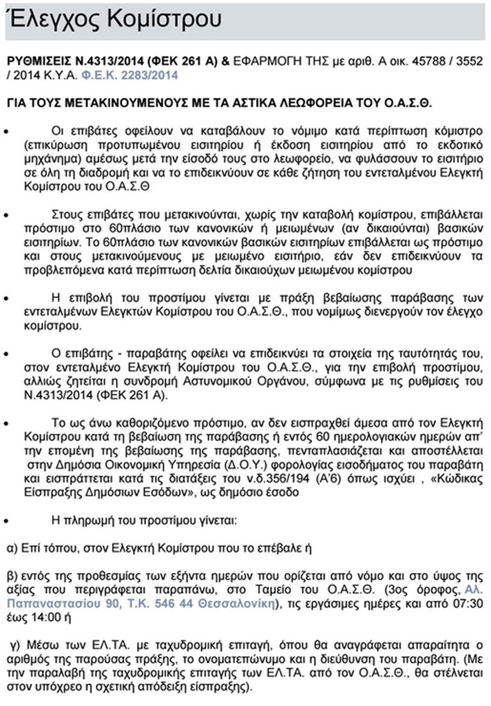 Στη σχετική Κοινή Υπουργική Απόφαση, που αφορά στον έλεγχο εισιτηρίου, ο νόμος είναι σαφέστατος και ξεκαθαρίζει πως ο επιβάτης -παραβάτης οφείλει να επιδεικνύει τα στοιχεία της ταυτότητάς του, στον εντεταλμένο Ελεγκτή Κομίστρου του Ο.Α.Σ.Θ., για την επιβολή προστίμου, αλλιώς ζητείται η συνδρομή Αστυνομικού Οργάνου, σύμφωνα με τις ρυθμίσεις του Ν.4313/2014 (ΦΕΚ 261 Α).