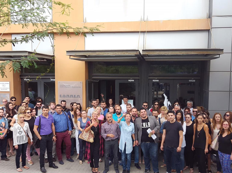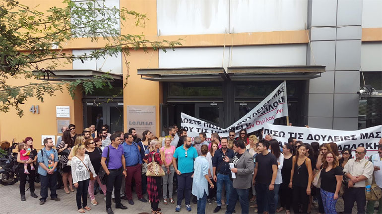 Πάνω από 100 εργαζόμενοι του Εκπαιδευτικού Ομίλου ΞΥΝΗ μαζεύτηκαν σήμερα το πρωί στις εγκαταστάσεις του ΕΟΠΠΕΠ ( Εθνικός Οργανισμός Πιστοποίησης Προσόντων και Επαγγελματικού Προσανατολισμού) συνοδεύοντας την Επιτροπή Εργαζομένων του ομίλου.