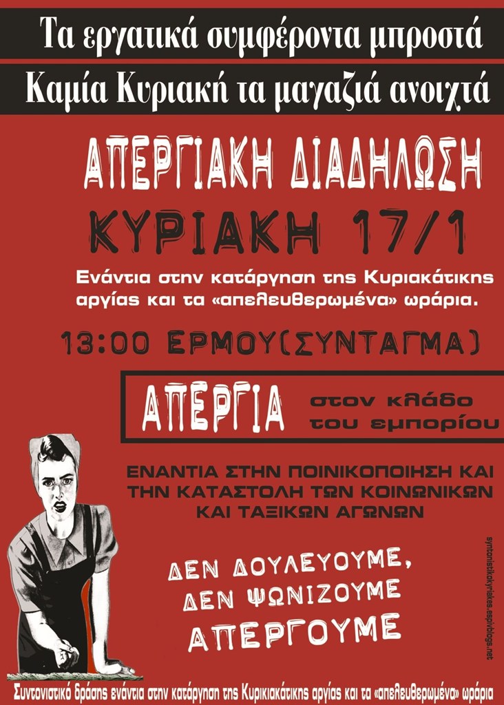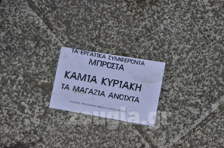 Παράσταση διαμαρτυρίας πραγματοποίησαν το μεσημέρι της Κυριακής στο κέντρο της Αθήνας περίπου 50 μέλη συλλογικοτήτων που αντιτίθενται στη λειτουργία των εμπορικών καταστημάτων τις Κυριακές. Οι συγκεντρωμένοι πέταξαν φυλλάδια και φώναξαν συνθήματα στην οδό Ερμού.