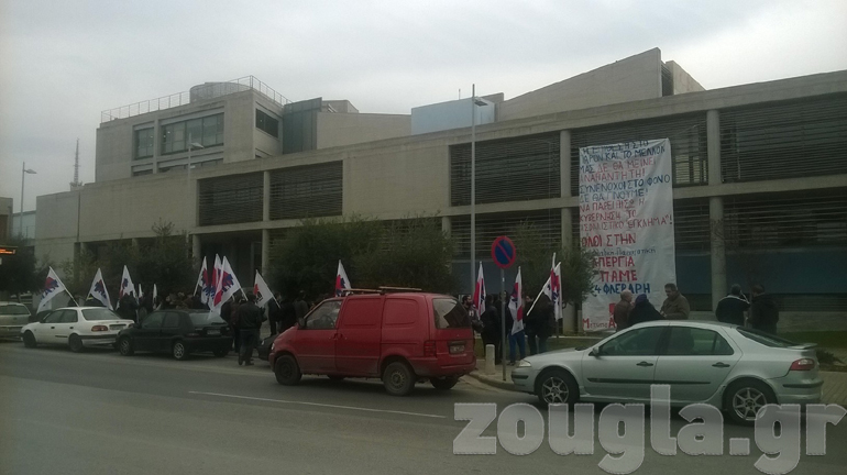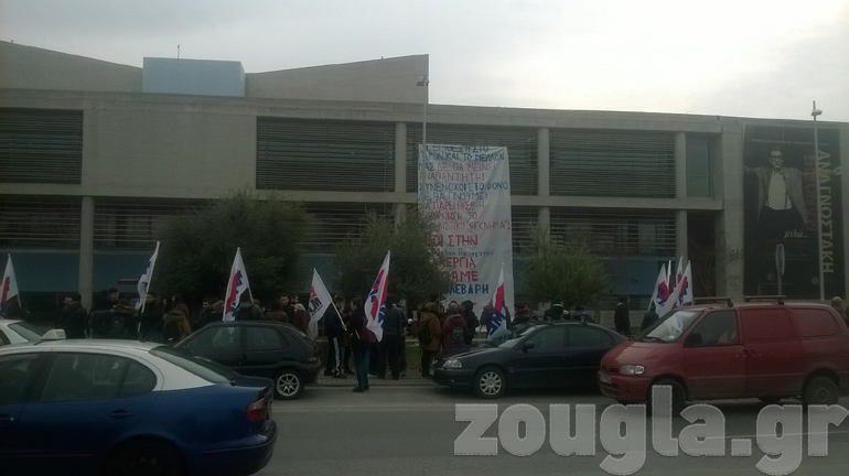 Οι διαδηλωτές ανήρτησαν πανό στην πρόσοψη του κτηρίου, επί της οδού Βασ. Όλγας, με το οποίο καλούσαν εργαζομένους, ανέργους, συνταξιούχους και φοιτητές στη μεγάλη απεργιακή κινητοποίηση, που είναι προγραμματισμένη για την Πέμπτη 4 Φεβρουαρίου 2016.
