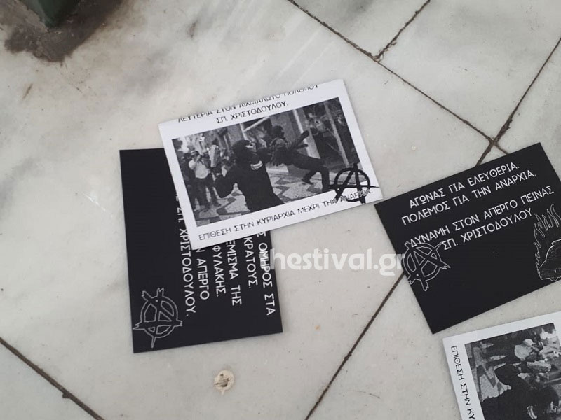 Οι αντιεξουσιαστές πέταξαν τρικάκια, φώναξαν και έγραψαν συνθήματα στον πρώτο όροφο του κτηρίου στην οδό Εγνατία 46 για τον απεργό πείνας Σπύρο Χριστοδούλου.