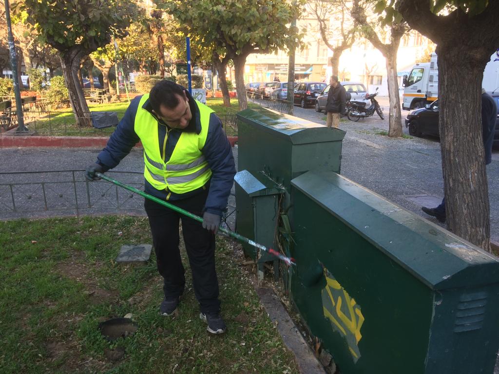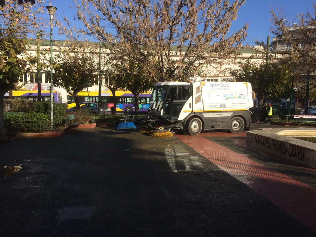 Οι εργαζόμενοι έβαψαν όλα τα παρτέρια, τα παγκάκια αλλά και τα μεταλλικά καλύμματα στους πίνακες ηλεκτρισμού της πλατείας που ήταν γεμάτα από γκράφιτι. Επίσης, επισκεύασαν τα καλαθάκια απορριμμάτων, αντικαθιστώντας όσα ήταν κατεστραμμένα, ενώ ο χώρος πλύθηκε με πεπιεσμένο νερό που περιείχε καθαριστικό-απολυμαντικό υγρό.