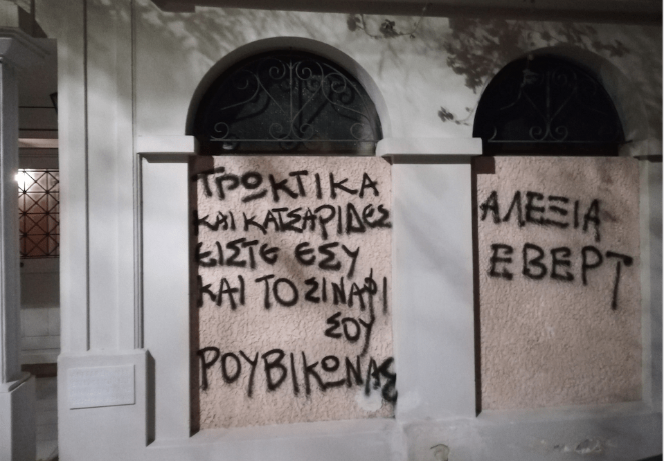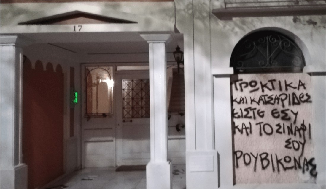 «Τρωκτικά και κατσαρίδες είστε εσύ και το συνάφι σου» ανέφερε το σύνθημα που έγραψαν σε τοίχο του σπιτιού της τα μέλη του «Ρουβίκωνα».