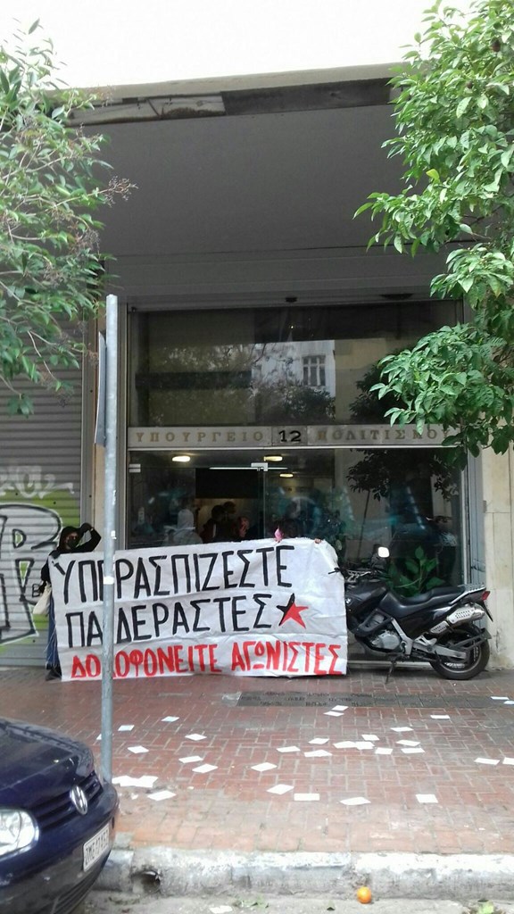 Είμαστε οι καλλιτέχνες που αναγκαζόμαστε να ζούμε υπό το καθεστώς της ανασφάλιστης εργασίας με απλήρωτες εργατοώρες, να αναπαράγουμε την σάπια κουλτούρα τους έχοντας πλέον και τους τρομονόμους πάνω από το κεφάλι μας.Είμαστε όλοι και όλες που αναγνωρίζουμε ότι η απεργία πείνας του πολιτικού κρατούμενου Δημήτρη Κουφοντίνα δεν αποτελεί μια μεμονωμένη υπόθεση, αλλά συνδέεται άμεσα με όλα τα ανοιχτά κοινωνικά μέτωπα. Η βάρβαρη κατασταλτική επίθεση που δεχόμαστε είναι κοινή και μας απειλεί όλους και όλες. Έτσι κοινός οφείλει να είναι και ο αγώνας για μια κοινωνία ισότητας και αλληλεγγύης.Για αυτό αποφασίσαμε να μπούμε στο συγκεκριμένο υπουργείο όπου συνδέεται με την συγκάλυψη κατά συρροή βιασμών/κακοποιήσεων/ εξευτελισμών για να καταγγείλουμε την επερχόμενη δολοφονία του απεργού πείνας από την κυβέρνηση δολοφόνων της Νέας Δημοκρατίας, να απαιτήσουμε να ικανοποιηθούν τα αιτήματα του, να εκφράσουμε την αλληλεγγύη μας στα αιτήματα των εργαζομένων στον χώρο του πολιτισμού και να αναδείξουμε το κοινό νήμα που συνδέει τα ειδεχθή εγκλήματα της εξουσίας.