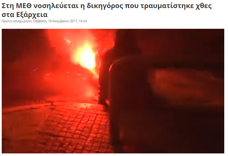 Η δικηγόρος βρισκόταν στη συμβολή των οδών Νοταρά και Κουντουριώτη και μιλούσε με φωτορεπόρτερ, όταν ξαφνικά μία φωτοβολίδα ευθείας βολής- την οποία εκτόξευσαν κουκουλοφόροι- καρφώθηκε στο γόνατό της.