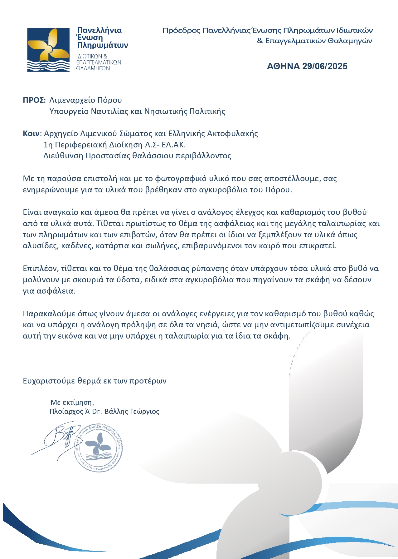 Με επιστολή του προς το Λιμεναρχείο Πόρου και τις αρμόδιες λιμενικές αρχές, ο πρόεδρος της ΠΕΠΙΕΘ (Πανελλήνιας Ένωσης Πληρωμάτων), cpt Dr. Γιώργος Βάλλης, ζήτησε την άμεση λήψη μέτρων για τον καθαρισμό του βυθού στο αγκυροβόλιο του Πόρου από υλικά που εγκυμονούν κινδύνους για την ασφάλεια της ναυσιπλοΐας.