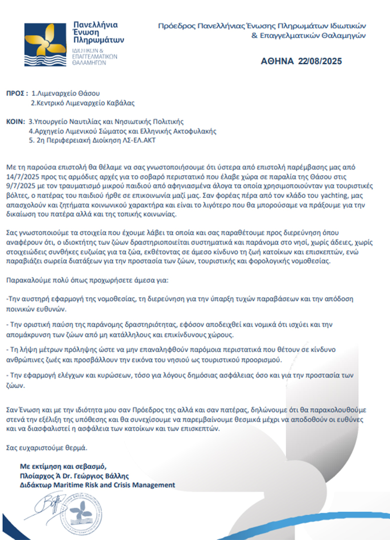 Ο πατέρας της 5χρονης, η οποία στις 9 Ιουλίου 2025 ποδοπατήθηκε από αφηνιασμένα άλογα που χρησιμοποιούνταν για τουριστικές βόλτες στην παραλία της Σκάλας Ποταμιάς στη Θάσο, απευθύνθηκε στην Πανελλήνια Ένωση Πληρωμάτων Ιδιωτικών και Επαγγελματικών Θαλαμηγών (Π.Ε.Π.Ι.Ε.Θ.) και στον πρόεδρό της, CptDr. Γιώργο Βάλλη, ζητώντας την άμεση παρέμβασή τους.