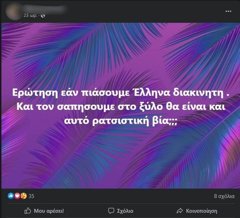 «Στα πλαίσια της αποστολής σας για την τήρηση της νομιμότητας και την διαφύλαξη των κανόνων της δημόσιας τάξης (άρθρ. 28 παρ. 2 Ορ.Δικ.), αποστέλλουμε: α) Το από 25-8-2023 δελτίο τύπου του Δικτύου Καταγραφής Περιστατικών Ρατσιστικής Βίας, που συντονίζει η Εθνική Επιτροπή για τα Δικαιώματα του Ανθρώπου και η Ύπατη Αρμοστεία του ΟΗΕ για τους Πρόσφυγες στην Ελλάδα, με τίτλο “Σοβαρή ανησυχία για την κλιμάκωση της στοχοποίησης προσφύγων και μεταναστών”, όπου μάλιστα γίνεται λόγος για “γενικότερο κλίμα στοχοποίησης και ρατσιστικών συμπεριφορών ενάντια σε πρόσφυγες και μετανάστες” και για “επιδεινούμενο κλίμα” κατ’ αυτών “στον πολιτικό και δημόσιο λόγο”, β) δημοσίευμα που αναρτήθηκε στην ιστοσελίδα www.in.gr στις 28-8-2023 με τίτλο “Έβρος: οι αυτόκλητοι πολιτοφύλακες συνεχίζουν τη δράση τους – νέο βίντεο”, γ) δημοσίευμα που αναρτήθηκε στην ιστοσελίδα www.efsyn.gr στις 25-8-2023 με τίτλο “Οι ακροδεξιοί σερίφηδες του Έβρου μέσα από τα μάτια της LeMonde” και δ) δημοσίευμα που αναρτήθηκε στην ιστοσελίδα ThePressProject στις 23-8-2023 με τίτλο “Έβρος: Φασίστες καλούν σε πογκρόμ προσφύγων και μεταναστών μέσω viber” και παρακαλούμε να διερευνήσετε ταχέως, ενδελεχώς και λυσιτελώς τη βασιμότητα ή μη των πολλαπλών καταγγελιών σ’ αυτά, καθώς επίσης σε όσα άλλα σχετικά δημοσιεύματα αναφερθούν προσεχώς συγκεκριμένα αξιόποινα περιστατικά, στα οποία προδήλως ενδείκνυται η εφαρμογή της αυτόφωρης διαδικασίας, προς εξάλειψη οποιουδήποτε ίχνους αναβίωσης του μεσαιωνικού φαινομένου της αυτοδικίας που μπορεί να εκθέσει διεθνώς τη χώρα μας».