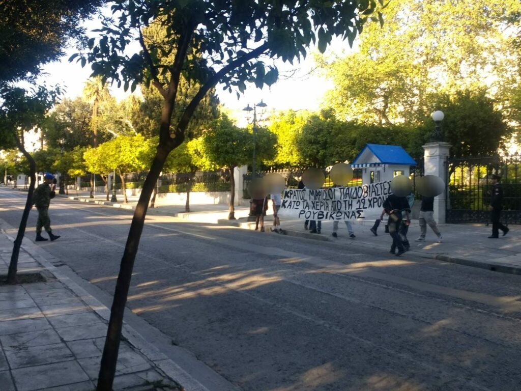 Παρέμβαση με πανό έξω από το Προεδρικό Μέγαρο σε μια κίνηση συμπαράστασης για τη 12χρονη της υπόθεσης του Κολωνού, πραγματοποίησε η συλλογικότητα του Ρουβίκωνα. Κατά τη διάρκεια της παρέμβασης, έλαβαν χώρα και προσαγωγές μελών της από την αστυνομία.