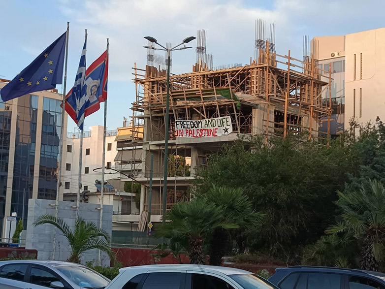 Η ομάδα τοποθέτησε επίσης πανό, στο κτίριο που βρίσκεται απέναντι από την πρεσβεία, το οποίο γράφει «Freedom and Life in Palestine» (Ελευθερία και ζωή στην Παλαιστίνη).