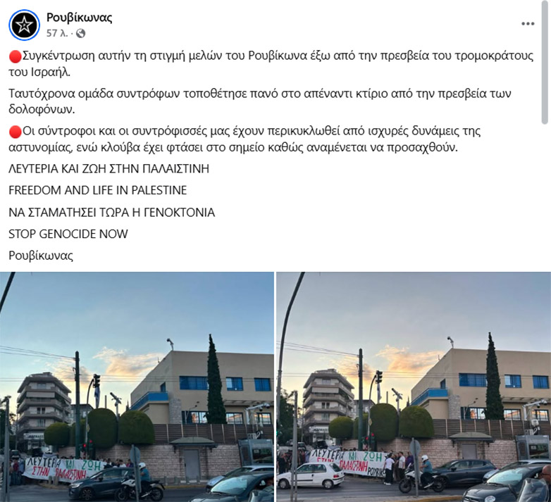 Στην πρεσβεία του Ισραήλ βρέθηκε η αναρχική ομάδα του Ρουβίκωνα το απόγευμα της Κυριακής 1/6, πραγματοποιώντας ειρηνική παρέμβαση για τη γενοκτονία που συντελείται σε βάρος των Παλαιστινίων στη Γάζα.