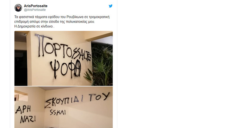 «Τα φασιστικά τάγματα εφόδου του Ρουβίκωνα σε τρομοκρατική επιδρομή απόψε στην είσοδο της πολυκατοικίας μου. Η Δημοκρατία σε κίνδυνο…» έγραψε ο Άρης Πορτοσάλτε και δημοσίευσε δυο φωτογραφίες από τα συνθήματα που έγραψαν στον τοίχο έξω από το σπίτι του.