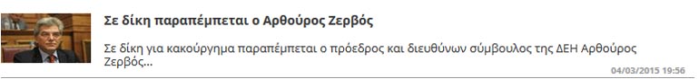 Απομακρύνεται από την ηγεσία της ΔΕΗ ο πρόεδρος και διευθύνων σύμβουλος Αρθούρος Ζερβός έπειτα από την απόφαση του Συμβουλίου Εφετών να τον παραπέμψει για κακούργημαΟ κ. Ζερβός, σύμφωνα με απόφαση του Συμβουλίου Εφετών, θα δικαστεί για παράνομες αυξήσεις, πάνω από τα ανώτατα επιτρεπόμενα όρια, τις οποίες χορήγησε σε 19 στελέχη της επιχείρησης μεταξύ 2010 και 2012.