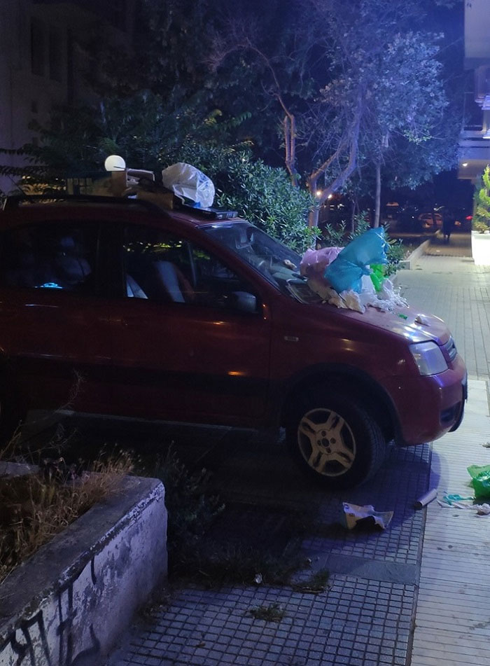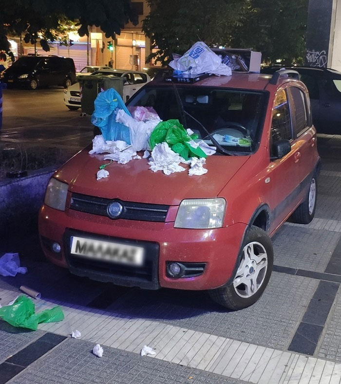 Με σκουπίδια «στόλισαν» άγνωστοι το Ι.Χ. ενός οδηγού στη Θεσσαλονίκη, το οποίο ήταν σταθμευμένο σε πεζοδρόμιο.