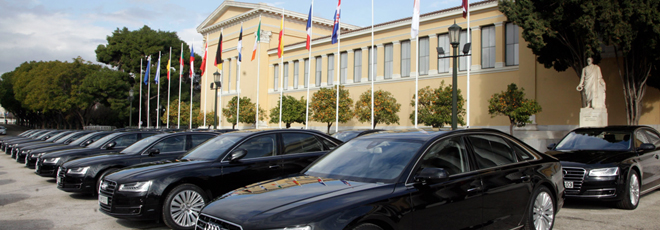 Οι 45 λιμουζίνες (μεταξύ αυτών και θωρακισμένα) της Audi A8L βρίσκονται στις θέσεις τους, προκειμένου αύριο να μεταφέρουν τον πρόεδρο της Κομισιόν Ζοζέ Μπαρόζο και τον πρόεδρο του Ευρωπαϊκού Συμβουλίου Χέρμαν Βαν Ρομπάι, μαζί με τους 28 επιτρόπους.