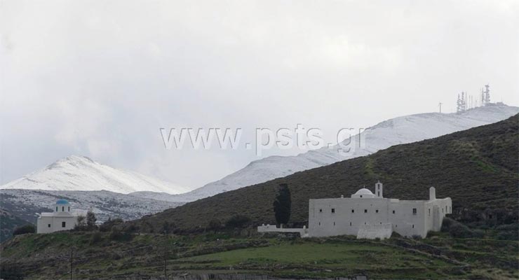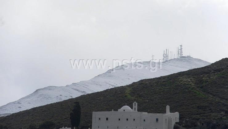 Οι αναμεταδότες όλων των τηλεοπτικών σταθμών βρίσκονται στους Αγίους Πάντες στην υψηλότερη κορυφή του νησιού που όπως βλέπετε από τις φωτογραφίες έχει σκεπαστεί από ένα λευκό πέπλο.