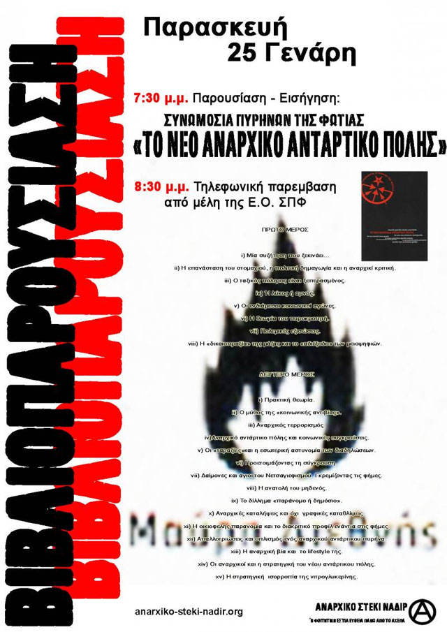 Σύμφωνα με τον ιστότοπο Indymedia, η παρουσίαση του βιβλίου με τίτλο: «Συνωμοσία Πυρήνων της Φωτιάς – Το νέο αναρχικό αντάρτικο πόλης» έχει προγραμματιστεί για τις 7.30 μ.μ.. Θα παρέμβουν τηλεφωνικά και κρατούμενα μέλη της οργάνωσης.