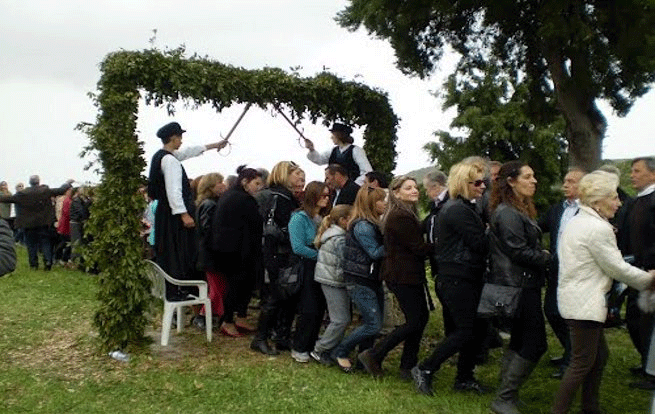 Ο χορός περνά κάτω από δάφνινη αψίδα, όπου υπάρχουν δύο παλικάρια με υψωμένα σπαθιά, και στη μέση του τραγουδιού διπλώνεται στα δύο, με τους χορευτές να περνούν ο ένας απέναντι από τον άλλο για τον τελευταίο χαιρετισμό. Κατά τη διάρκεια της γιορτής μοιράζεται καφές που βράζει σε μεγάλο καζάνι «ζωγραφίτικος», τσουρέκια και αυγά.