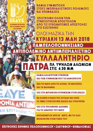 Το συλλαλητήριο διοργανώνουν οι Επιτροπές Ειρήνης Πελοποννήσου , Ζακύνθου, Κεφαλονιάς απαιτώντας να μην μεταφερθούν πυρηνικά στον Άραξο, καμία συμμετοχή στους ιμπεριαλιστικούς πολέμους και επεμβάσεις, καμία αλλαγή συνόρων και των συνθηκών που τα καθορίζουν, να κλείσουν όλες οι ξένες στρατιωτικές βάσεις και τα στρατηγεία.
